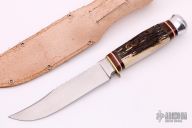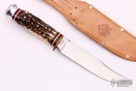 This Vintage Hunter by Puma knives features a satin finished blade with sawteeth on the spine, .215" blade stock and .979" blade depth, hidden tang construction. The handle has a brass guard, stag grip, aluminum butt, wood/red/white spacers. Comes with a brown leather sheath. Excellent condition.