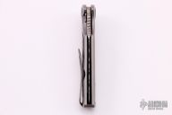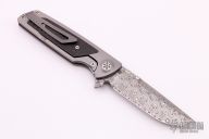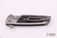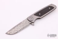 This Micro Typhoon flipper from Brian Nadeau/Sharp by Design features a Damasteel Blade with swedge. The handle features fine bead blasted titanium scales with carbon fiber inlays. Matching titanium pocket clip and backspacer. Blade is centered when closed, flips well with no wrist action needed, and locks up with no play. Knife is in excellent condition, shows no signs of use or carry.