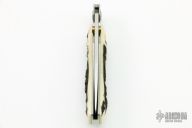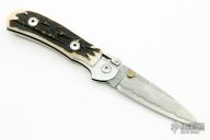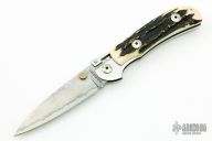 This original One Handed Folder by A.G. Russell features a San Mai Damascus drop point blade with dual brass thumbstuds. The handle is comprised of an integral stainless steel frame with stag scales, lanyard hole on pommel. Some minor scratches on frame but otherwise excellent condition.