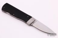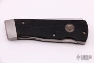This Rolox by Benchmark Knives features a matte finished blade with swedge and notched thumbrest. The handle has a matte finished stainless steel frame and black linen micarta scales, stainless steel liners and backspacer. Comes with original nylon sheath. Has some light scuffs, otherwise excellent condition.