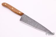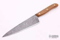 This Chef's Knife by Jeffrey A Melius features a Damascus blade (1084 and 15N20) with .137" blade stock and 2.040" blade depth, full tang construction. The blade has a distal taper. The handle has roasted curly maple scales with brass pins. New from maker.