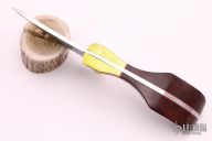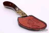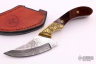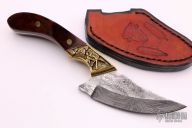 This Skinner features an upswept Damascus blade with a full tang construction.  .155" Blade Stock.  1.414" Blade Depth.  The handle features deep sculptured engraved brass bolsters complemented by wood scales.  Includes a brown leather sheath.  New from maker.
