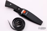 This divers knife by Hattori features a rubber handle that is textured for grip and a stainless steel guard. Satin finish double-edged blade with serrations on either side, .188" blade stock and 1.028" blade depth. Includes a black plastic sheath, original box and leg strap. Some scratches on blade, otherwise excellent condition.
