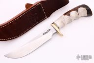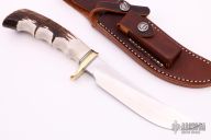 This Model 4-6 by Randall Made Knives features a satin finished stainless steel blade with notched thumbrest, .220" blade stock and 1.135" blade depth, hidden tang construction. The handle has a brass guard, finger grip stag handle with black and brass spacer pattern. Comes with a brown leather sheath and original paper wrapping. New from maker.
