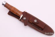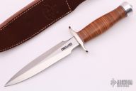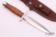 The Model 2 is a heavily made dagger or dirk. This knife has an 6" carbon steel blade with .202" blade stock and 1.155" blade depth, hidden tang construction. The handle has a double nickel silver guard, stacked leather grip with red/white/blue spacers, duralumin butt. Comes with a brown leather sheath and original paper wrapping. New from maker.