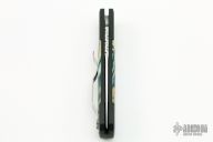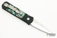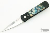 This custom Godson by Protech Knives features a satin polished finished blade with hand file work along the spine. The handle is comprised of an aluminum frame with mammoth molar inlays and push button. Tip up black stainless steel clip. Comes with original box and paper work, excellent condition.