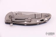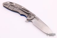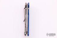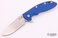 This XM-18 Slicer Flipper by Rick Hinderer Knives features a stonewashed finished blade, notched thumbrest and flipper, dual thumbstuds. The handle has a blue G-10 scale, and stonewashed titanium handle/clip. Clip can be mounted for tip up or down carry. Nice lockup, seating, and detent. Comes with original box. Excellent condition.