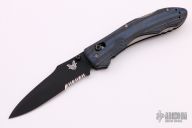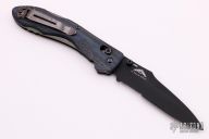 This 930SBK Kulgera from Benchmade features a black finish spear point partially serrated blade with swedge and dual thumbstuds. The handle is comprised of blue and black G10 scales over black steel liners and stand-offs. Stainless steel tip up clip is reversible for left or right hand carry. Excellent Condition. Includes the original box and papers.
