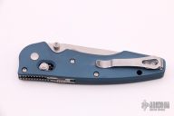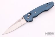 This 477-1 Emissary from Benchmade features a satin finish drop point blade with swedge and dual thumb studs. The handle is comprised of a teal aluminum frame over a stainless steel sub frame. The blade fires out quickly with the assisted opening. Stainless steel tip up clip is reversible for left or right hand carry. Sliding safety on spine. Includes original box, paperwork. Excellent condition. First Production Run #742/750