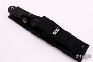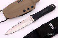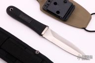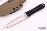 "Originally designed as back-up for law enforcement and military personnel, the Pentagon series is now popular with outdoor knife enthusiasts as well. The Pentagon offers the instant choice between a serrated or beveled edge for cutting options. Twin thumb notches enable accurate blade orientation and downward control. The aggressively checkered, flared handles provide confident gripping as well as sensational feel and balance." Comes with a custom kydex sheath, original nylon sheath, box and papers. Excellent condition.