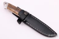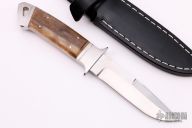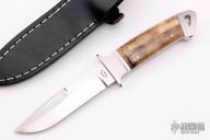 This Integral Chute Knife from Dietmar Kressler features a clip point hand rubbed satin finish blade with a sharpened top edge, .196" blade stock and 1.049" blade depth. The handle has integral fluted bolsters and beautiful walrus ivory scales with red liners and a tapered tang. Comes with a black leather sheath with belt loop. Excellent condition. A beautiful piece. Comes with a zippered case.