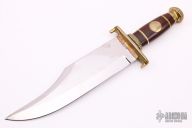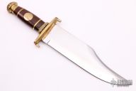 This Iron Mistress Bowie by John Nelson Cooper features a satin finished clip point blade with sharpened top edge, .242" blade stock and 2.471" blade depth, hidden tang construction. The handle has a brass guard, brown canvas micarta grip with brass spacers and escutcheon and a fileworked brass butt cap. Has some light scratches and patina, otherwise excellent condition for its age. Comes with a zippered case.