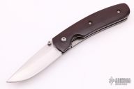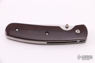 This linerlock by Mel Pardue features a hand rub satin finished blade with single thumbstud. The handle has maroon linen micarta scales, titanium liners and stainless steel backspacer. Nice detent, lockup and blade seating. Excellent condition.