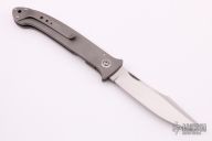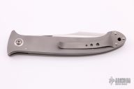 This legendary knife by Bob Lum features a hand rubbed satin finished clip point blade with nail nick and false top edge. The handle has bead blasted titanium scales and liner, black G-10 backspacer and a tip up bead blasted titanium clip. Lanyard hole at the butt. Nice detent, lockup and blade seating. Excellent+ condition. This may be your last chance to buy one of these amazing knives. Comes with a zippered case.