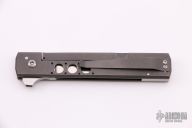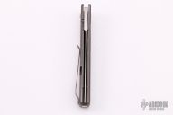 This Buzz by Jason Clark features a satin finished blade with swedge and checkered flipper. The handle has a tumble finished titanium frame with  tip up titanium clip and a stainless steel backspacer. Rides on IKBS. Comes with leather zippered case. Nice detent, lockup and blade seating. Excellent condition. Comes with COA dated Nov, 9 2017.