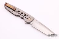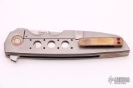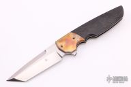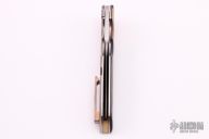 This Snap Back Flipper by Jason Clark features a hand rub satin finished blade with a false top edge and checkered flipper. The handle has a dovetailed hammered copper bolster, marble carbon fiber scale, orange peel finished titanium liner and lockside with hammered copper tip up clip and backspacer. Rides on IKBS, nice detent, lockup and blade seating. Comes with a leather case and COA. Excellent condition.