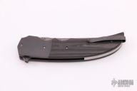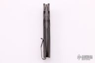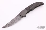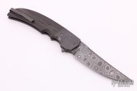 This Persian by Jason Clark features a Chad Nichols Black Eyes Damascus blade with checkered flipper and false top edge. The handle has a dovetailed zirconium bolsters, unilateral carbon fiber scales, blasted titanium liners and tip up clip, stainless steel backspacer. Rides on IKBS, nice detent, lockup and blade seating. Comes with leather case and COA. Excellent condition.