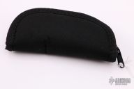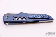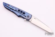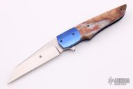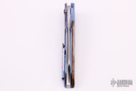 This Wharncliffe flipper by Jason Clark features a satin finished blade with false top edge and notched flipper. The handle has a single dovetailed anodized titanium bolster, mammoth tooth scale, anodized and orange peel finished titanium liner and lockside, stainless steel backspacer and tip up Timascus clip. Nice detent, lockup and blade seating. Comes with a zippered case. Excellent condition.