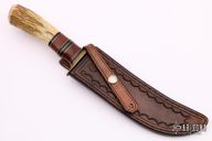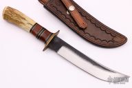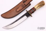 This Large Hunter by Roger Mudbone Jones features a hand rub satin finished blade hand forged from an antique mill file with .236blade stock and 1.371blade depth, hidden tang construction. The handle has a hammered bronze guard, spacer pattern consisting of black/brass/brown linen micarta, stag grip. Comes with a hand tooled leather sheath by Mudbone. Has a few light scratches and a little patina on the bronze, otherwise excellent condition.