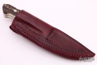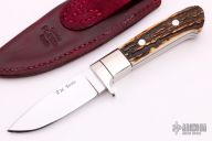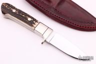 This drop point hunter by Phillip M Parris features a mirror polished blade with .179" blade stock and 1.021" blade depth, full tang construction. The handle has a steel guard, stag scales with brown liners and steel pins. Comes with a hand tooled maroon leather sheath. New from maker.