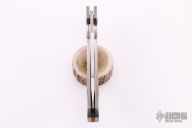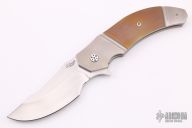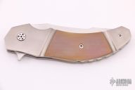 This N° 260 linerlock flipper by Sergio Consoli features a hand-rub satin finished upswept recurve blade with flipper. The handle has satin finished and partially anodized and fluted titanium scales, Inox steel liners, and an anodized titanium backspacer. Sergio's ball bearing system gives the knife an effortless flip that requires no wrist action. Nice lockup, detent and blade seating. Outstanding work. Excellent condition. Comes with zippered case and COA dated November 2016.