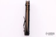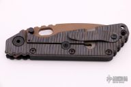 This SMF by Strider Knives features a bead blasted copper beryllium blade and textured black G-10 and flamed titanium handle and matching tip up titanium clip. Notches on thumbrest, rear of handle, and early lockup. Includes Hinderer "Lock Bar Stabilizer" for maximum reverse lock retention. New from maker. This knife was originally designed as an EOD knife (except there is a stainless steel pivot, so it isn't completely non-magnetic)