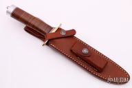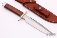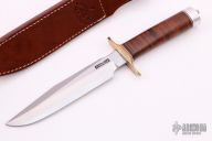 This Model 1-7 from Randall Made Knives features a satin finished clip point blade with sharpened top edge, .210" blade stock and 1.263" blade depth, hidden tang construction. The handle is comprised of a brass guard, red/white/blue spacers, stacked leather handle and duralumin pommel. Comes with brown leather sheath. Excellent condition.