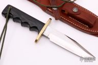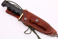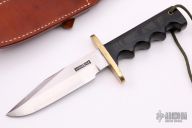 This Model 15 Airman by Randall Made Knives features a clip point blade with a sharpened top edge, .216" stock. 1.278" blade depth. Sharpened top edge, full tang construction. The handle has black linen micarta handle with finger grips and a brass guard. The Model 15 is designed especially for heavy-duty use and to be as nearly indestructible as possible. Comes with a brown leather sheath. Excellent condition.
