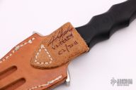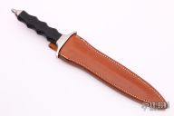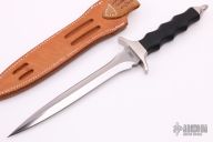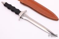 This is Vaughn Neeley's DA "Custom Dagger", a design he came up with in 2011. The pinpoint blade is 440C stainless made from 1/4" stock -- 303 series stainless steel fittings (guard and pommel) at both ends of a one piece custom shaped black linen micarta handle. Comes with brown leather sheath signed and dated and a zippered case. Excellent condition. #020