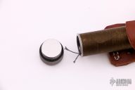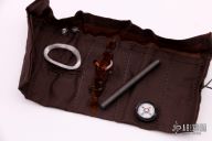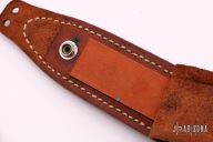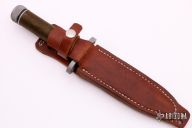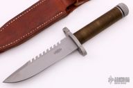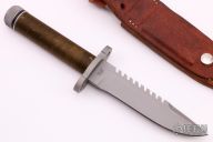 This survival knife by Vaughn Neeley features a bead blasted spear point blade with serrated top edge and 8 saw-teeth on blade spine. .252" blade stock and 1.241" blade depth, hidden tang construction. The handle has a bead blasted titanium double guard, hollow cord wrapped handle, and stainless steel removable butt cap with an O-ring to make it water-proof. Comes with brown leather sheath that has a leather flap with a snap covering a honing stone that is embedded in the sheath. Inside the handle is a roll-up kit with a fire stick, compass, fishing hooks, splitshots and a single fly, and slots to hold other items. The cord that is around the handle is also one piece of cord that can be removed for survival use. The removable butt cap has a polished flat inside that can be used for signaling. The blade is stamped "003SB" and "VN-1109". This knife was well-thought-out and provides everything possible for survival. Excellent condition. Comes with nylon zippered case.