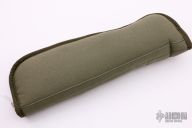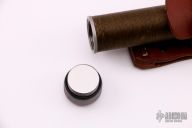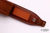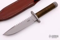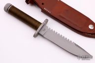 This survival knife by Vaughn Neeley features a bead blasted spear point blade with serrated top edge and 8 saw-teeth on blade spine. .249" blade stock and 1.319" blade depth, hidden tang construction. The handle has a bead blasted titanium double guard, hollow cord wrapped handle, and stainless steel removable butt cap with an O-ring to make it water-proof. Comes with brown leather sheath that has a leather flap with a snap covering a honing stone that is embedded in the sheath. Inside the handle is a roll-up kit with a fire stick, fishing hooks, splitshots and a single fly, and slots to hold other items. The cord that is around the handle is also one piece of cord that can be removed for survival use. The removable butt cap has a polished flat inside that can be used for signaling. The blade is stamped "021SE" and "VN-0410". This knife was well thought out and provides everything possible for survival. Excellent condition. Comes with nylon zippered case.