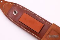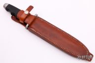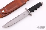 This fighter by Vaughn Neeley features a bead blasted blade with sharpened top edge, .245" blade stock and 1.334" blade depth, hidden tang construction. The handle has a bead blasted stainless steel guard and butt with a black linen micarta grip. Comes with a brown leather sheath with a sharpening stone in the back. Excellent condition. "047SG" and "VN-0312"on back of blade. Comes with a zippered case.