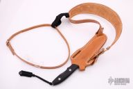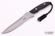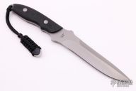 This Survival Chute Knife by Vaughn Neeley features a bead blasted blade with sharpened top edge, .224" blade stock and 1.142" blade depth, full tang construction with black linen micarta scales. Comes with a brown leather sheath and shoulder rig. Comes with a zippered case. Excellent condition. "022SF" and VN-1211" on the blade.