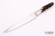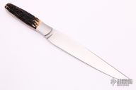 This Chinese Fighter by the late Bob Lum features a hand rub satin finished blade with .247" blade stock and 1.560" blade depth, full tapered tang construction. The handle has satin finished stainless steel bolsters, stag scales with red liners and stainless pins. Comes with a zippered case. Excellent condition. This knife was made about 20 years ago and it was and still is the largest Chinese Fighter that Bob ever made.