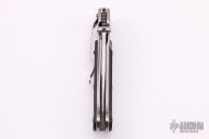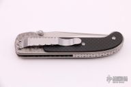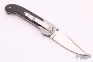 This Shark linerlock folder by Pat Crawford features a satin finished clip point blade with dual thumbstuds and checkered thumb ramp. The handle has a jeweled titanium frame with carbon fiber scales, titanium liner, fileworked stainless steel backspacer and tip down clip. Nice action, detent, and blade seating. Comes with a zippered case. Excellent condition.