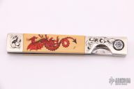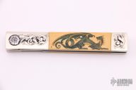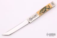 This Left Handed "Walker's Locker" by Michael Walker features a hand rub satin finished tanto style blade with swedge and nail nick. The handle has dovetailed and engraved nickel silver double bolsters and scrimshawed yellow paper micarta scales over stainless steel liners and nickel silver stand off. Engraving and scrimshaw done by Patricia Walker and dated '84. Numbered 044. Includes leather zippered case. Has some light scratches, otherwise excellent condition. A very early piece.