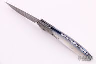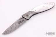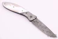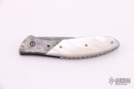 This liner lock by Ken Onion features a Damascus drop point blade with swedge and single thumb stud that has a Mother of Pearl inlay. The handle has Damascus bolsters and mother-of-pearl scales over anodized titanium liners and a fileworked stainless steel backspacer. Nice blade seating, detent, action and lock up, the knife fires open with Ken's patented "Speed Safe" assisted opening mechanism. Excellent condition. Comes with a zippered case.