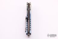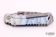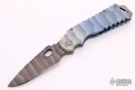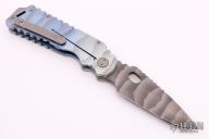 This Arktika from Medford Knife & Tool features a tiger striped compound ground blade with notched thumbrest and spine, thumbhole opening, 1/4" blade stock. The handle has a flamed and tumbled titanium frame, D2 skull crusher and backspacer, and a tip up titanium clip. Excellent condition. Looks like it might be missing one of the washers or something. The blade favors the lockside at the pivot.
