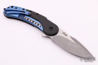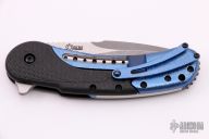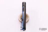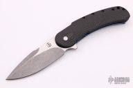 This Bodega by Begg Knives has a tumble finished spear point blade with satin finished flats, IKBS and a notched thumb rest. Handle is black carbon fiber with a anodized cracked ice finished titanium lock bar and a matching tip up clip with a ceramic ball. Nice detent, lockup and blade seating. Excellent Condition.