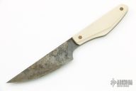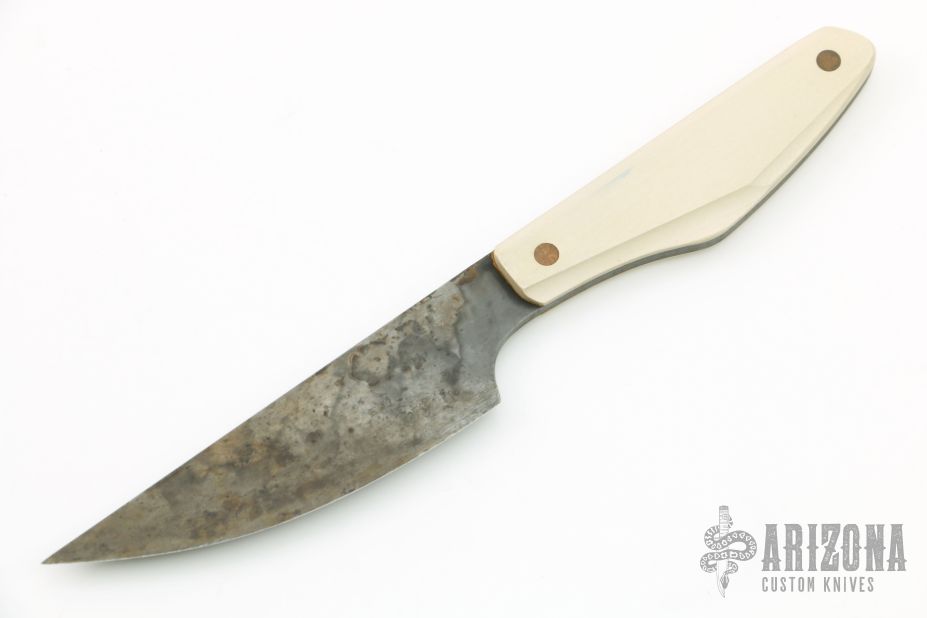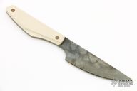 This Paring Knife by Jason Stout features a chisel ground blade with forced patina, .123" blade stock and 1.034" blade depth, full tang construction. The handle has ivory paper micarta scales with copper pins. Excellent condition.