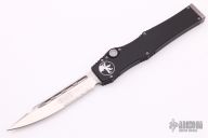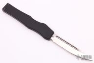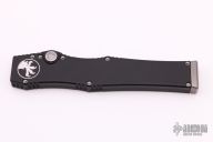 This Halo V OTF automatic has a satin finish single edge blade with a partially serrated edge. The handle is black aluminum. Dated 06/2011 and S/N 01931 on charging handle. Comes with original box, papers and sheath.  Blade Steel: S35-VN.  Excellent Condition.