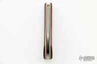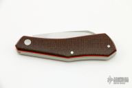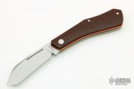 This slipjoint from Jared Oeser features barbed wire micarta covers over red/tan liners, and a steel spring. Hand rubbed satin finish blade with nail nick. Strong function. Spring is flush in closed, half stop, and open position.  Includes COA, Hank and a leather slip sheath.  There are a few light scuffs on the handle otherwise the knife is in Excellent Condition.