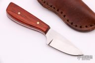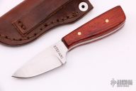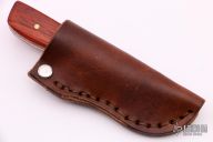 This small hunter by Randy Stefani features a hand satin finished blade with .137" blade stock and ..971" blade depth, full tang construction. The handle has dyed wood scales and brass pins. Includes a brown leather sheath. New from maker.