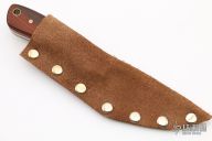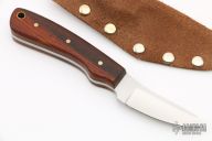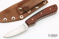 This knife by Randy Stefani features a satin finished blade with .134" blade stock and 1.08" blade depth, full tang construction. The handle has wood scales and brass pins. Includes a brown leather sheath. New from maker.