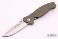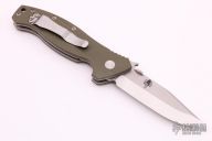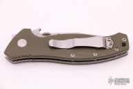 This Specwar was made by Emerson Knives for the Special Projects Division of Prometheus Design Werx. The PDW SPD Specwar features a two-tone clip point blade with tumbled flats, satin grinds, knurled thumb disc and wave feature with notched thumb rest. The handle is comprised of fully contoured OD Green G10 scales over titanium liners and barrel spacers. Lanyard hole with lanyard in pommel. The tumbled titanium PDW SPD pocket clip is positioned for right hand, tip up carry. Emerson logo on the "A" side of the blade with the PDW SPD logo on the reverse. Excellent condition.