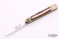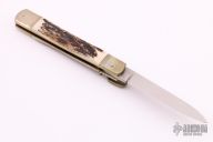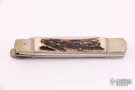 This leverlock auto by Hubertus features a spear point blade, nickel silver double bolsters, stag scales, and brass liners and pins. Opens with a nice snap. Very fast opening. This is the largest automatic knife that Hubertus Makes. Has some patina and light scratches, otherwise excellent condition.