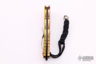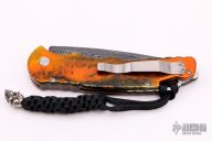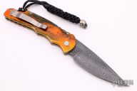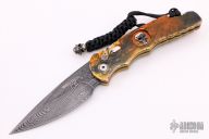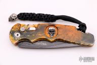 This TR-4.64 by Protech has a Zoe Crist All Tool steel Damascus spearpoint blade. The handle has a PK Custom Lava splash anodized aluminum with a sterling silver skull designed by Bruce Shaw inlaid. Satin finished stainless steel clip for tip up carry. Gold lip pearl inlaid push button. Steel glass breaker. Secondary safety switch. Includes Protech box, paperwork and sheath. Excellent Condition.