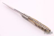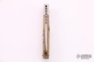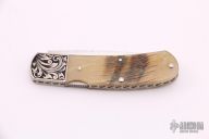 This lockback by Harvey Otis McBurnette features a hand rub satin finished blade with nail nick and fileworked spine. The handle has engraved and dovetailed nickel silver bolsters, big horn sheep covers, fileworked nickel silver liners, fileworked stainless steel backspacer. Nice lockup, function and blade seating. Excellent condition. Comes with a velcro case and COA dated March 1997.