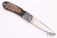 This lockback by Harvey Otis McBurnette features a hand rub satin finished blade with single thumbstud and fileworked spine. The handle has engraved and dovetailed nickel silver bolsters, big horn sheep covers, fileworked nickel silver liners, fileworked stainless steel backspacer. Nice lockup, function and blade seating. Excellent condition. Comes with a velcro case and COA dated March 1997.
