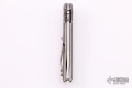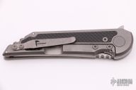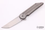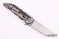This Kwaiback from Jake Hoback has a stonewashed upswept/tanto blade, notched thumb-rest and flipper. CBP caged bearing pivot. "Ps23" stamped on lockbar. Handle is titanium with a tumble finish and carbon fiber inlay, titanium barrel spacers and tumbled clip, tip up carry reversible, left or right. This knife has an adjustable detent. Nice lockup, and blade seating, flips like a boss. Includes original wooden box and COA. Excellent condition.